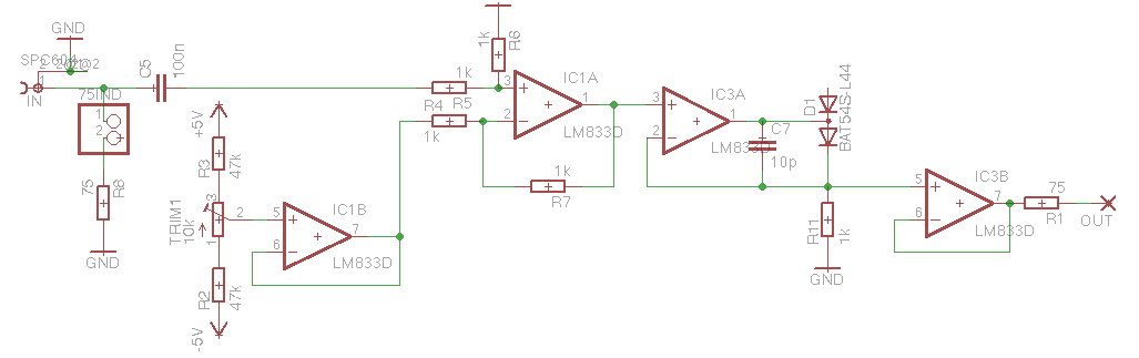 The differential amplifier IC1A shifts the signal to a level set by TRIM1 (not sure that we need voltage follower IC1B, but is was left over anyway).