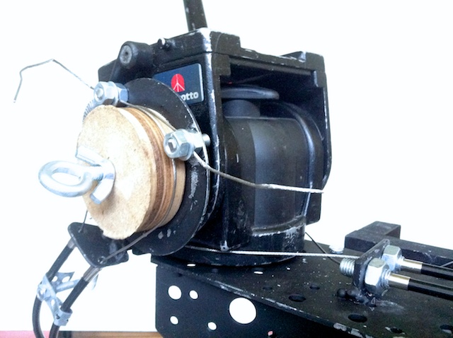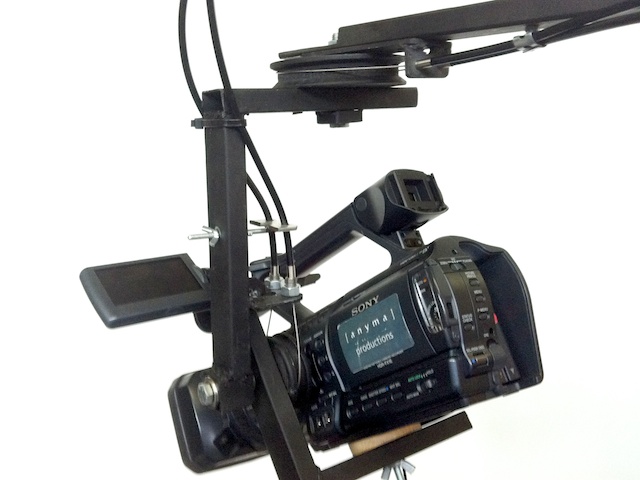 For the pan/tilt head I welded together two L-shapes, and connected them with bicycle gear wires to a slightly modified Manfrotto fluid tripod head (501).