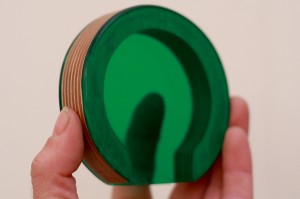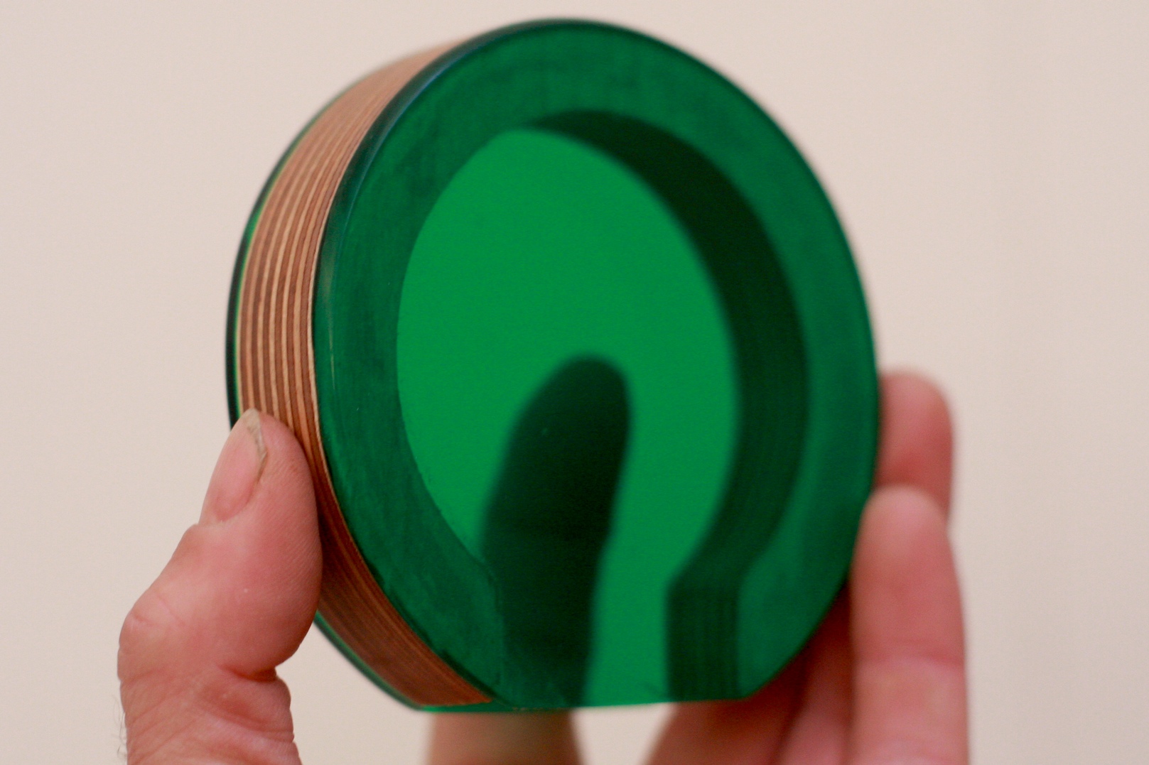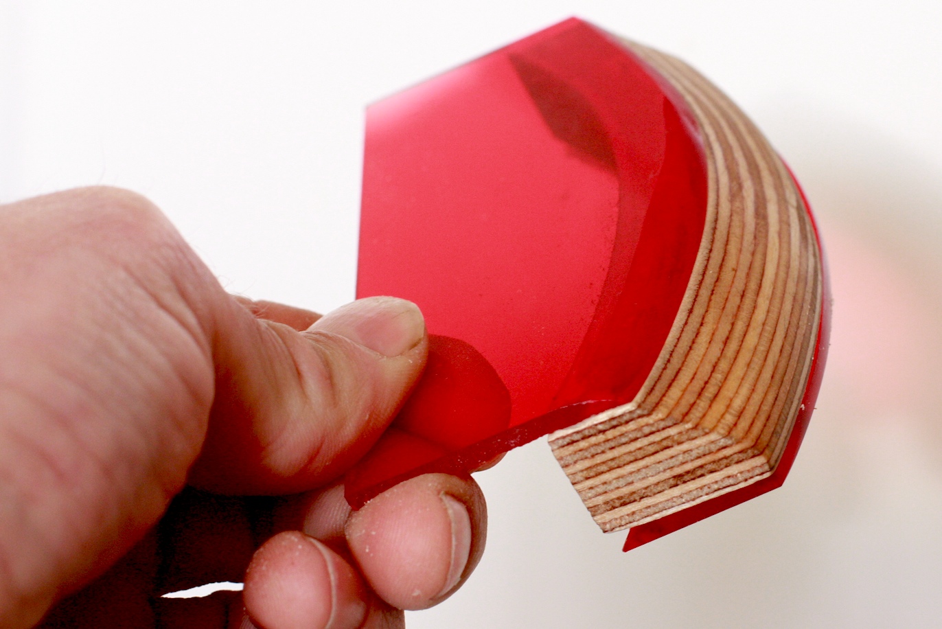 The bass will be again constructed from plywood and plexi, but i might go for a see-through design for the body. To be able to achieve round corners on the back of the instrument, I’d have to glue the glass directly on the wood. A first test with Forbo contact glue seems quite promising: