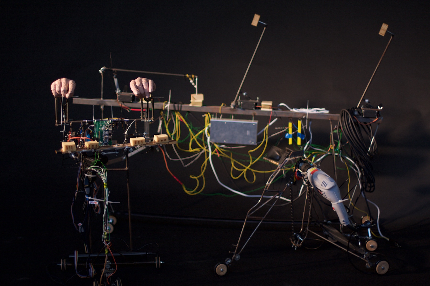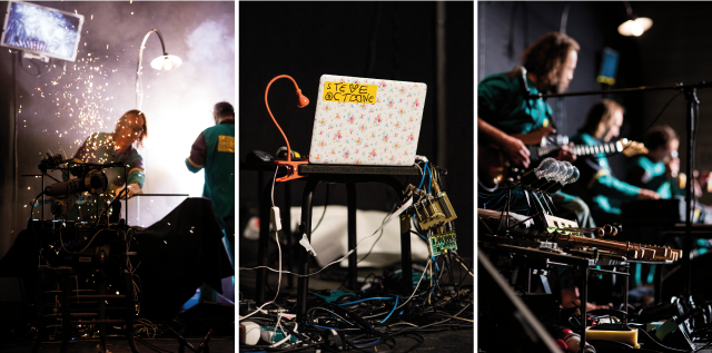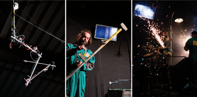 Ces créations accompagnent les acteurs sur scène et fabriquent avec eux la musique qu’ils composent ou les événements qu’ils déclenchent. Le travail des trois compères, basé sur la surprise et l’émerveillement, s’adresse à tous.